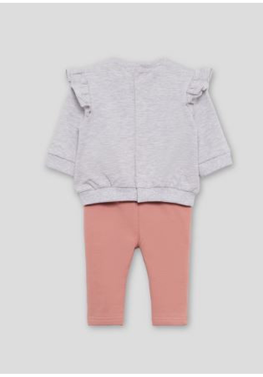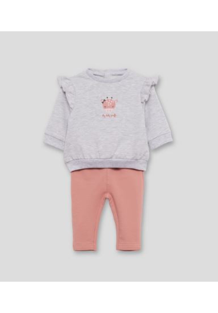 Conjunto de dos piezas, sudadera y leggings para recién nacido hasta la taya 24 meses. Este conjunto combina comodidad y ternura con un diseño encantador. La sudadera en color gris vigoré claro está decorada con un dulce dibujo de jirafa en el centro y la frase “my baby giraffe”. Presenta manga larga, cuello redondo y delicados volantes en los hombros, que aportan un toque femenino y alegre. Incorpora cierre trasero con botones en tallas de meses, para facilitar la puesta. Los leggings en color maquillaje están confeccionados en punto suave y elástico, con cinturilla cómoda que se adapta sin apretar. Un conjunto ideal para los primeros meses, pensado para moverse con libertad y estilo cada día.
