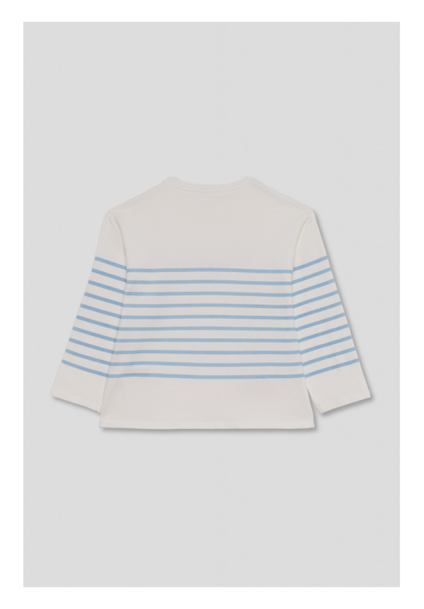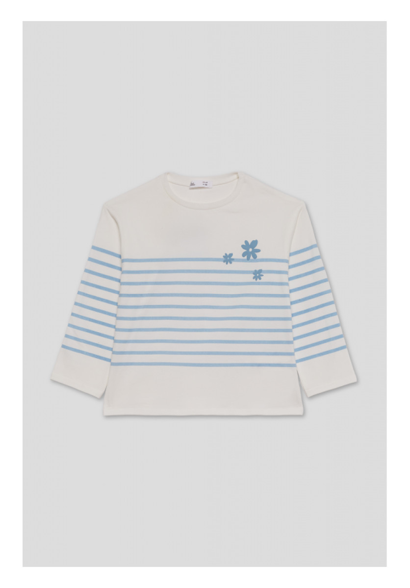 Camiseta de manga larga para niña. Camiseta en color crudo con estampado de rayas horizontales en azul celeste, confeccionada en punto suave y cómodo. Presenta cuello redondo y manga larga, con detalle de flores estampadas en el pecho que aportan un toque femenino al diseño marinero. Bajo recto y patrón relajado para mayor libertad de movimiento. Una prenda ideal para combinar en looks casuales con un aire fresco y divertido.