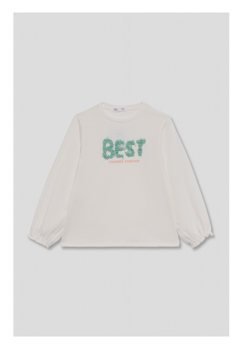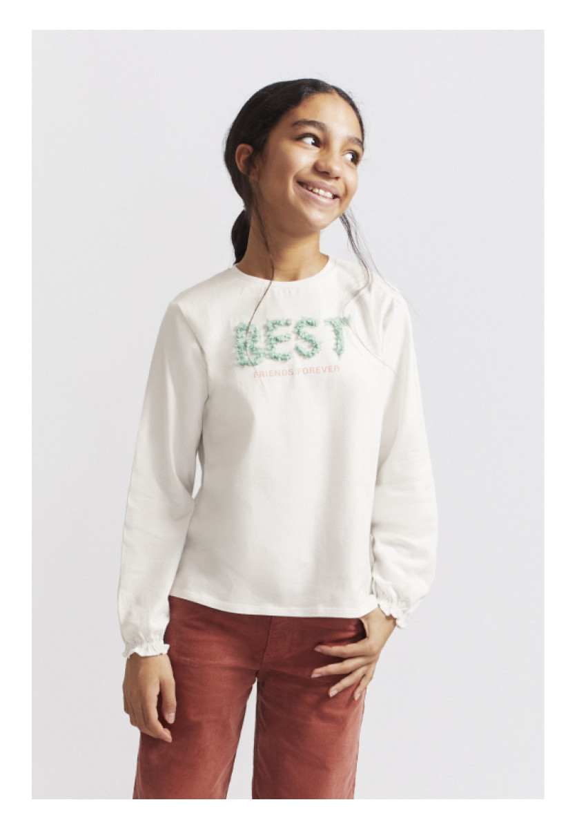 Camiseta de niña de manga larga. Camiseta en color crudo con cuello redondo y puños elásticos fruncidos. El diseño frontal destaca por la palabra “BEST” decorada con apliques de flores en relieve en tono verde agua, y el texto bordado “FRIENDS FOREVER” en coral debajo. Una prenda cómoda y con un toque romántico ideal para looks casuales y llenos de estilo