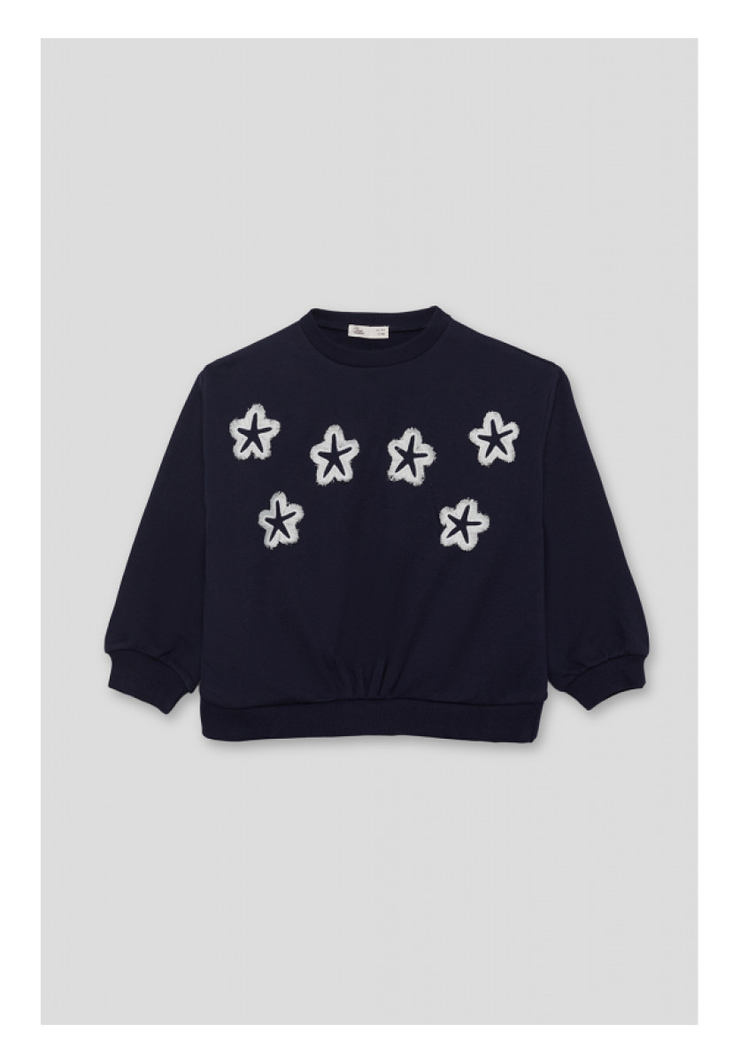 Sudadera de felpa en color marino con cuello redondo y bajo ligeramente fruncido. Luce bordado de estrellas de mar en el delantero, con textura en contraste. Los puños elásticos y el tejido confortable la convierten en una opción ideal para el día a día con un toque divertido.