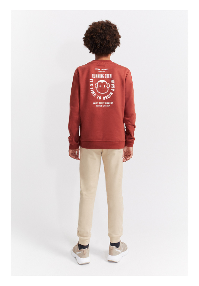 Conjunto de dos piezas, sudadera y pantalón para niño. Sudadera de manga larga en color leña con cuello redondo, puños y bajo elásticos en canalé. Presenta bolsillo frontal tipo plastrón con texto “IT'S TIME TO BEGIN” y estampado a contraste en la espalda con el icónico mono de Street Monkey. El pantalón jogger en color beige claro incluye cintura elástica con cordón ajustable, bolsillos laterales y bajo en canalé. Un conjunto cómodo y actual para disfrutar del invierno con estilo.