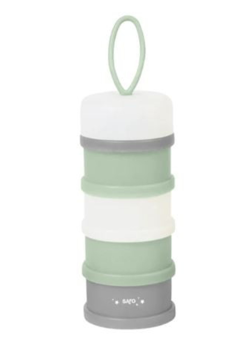 Práctico contenedor de cuatro cuerpos para guardar las dosis exactas de leche en polvo, cereales, etc., ya preparadas para cada toma. Evitando así llevar grandes paquetes. También se puede guardar el chupete.