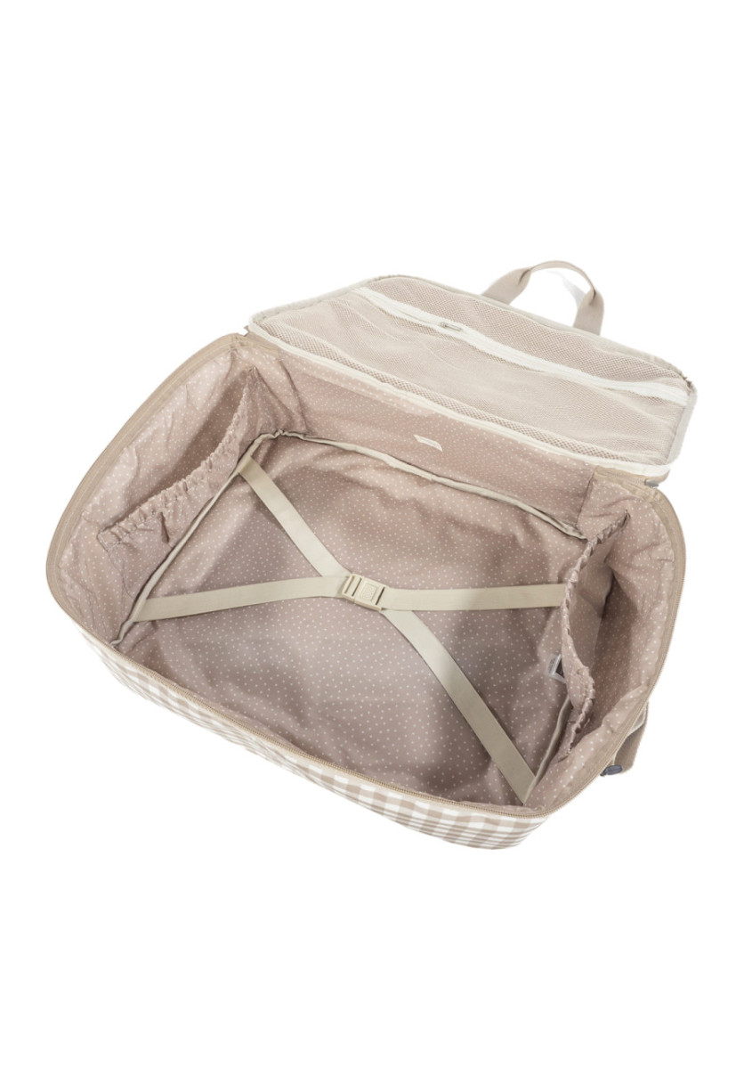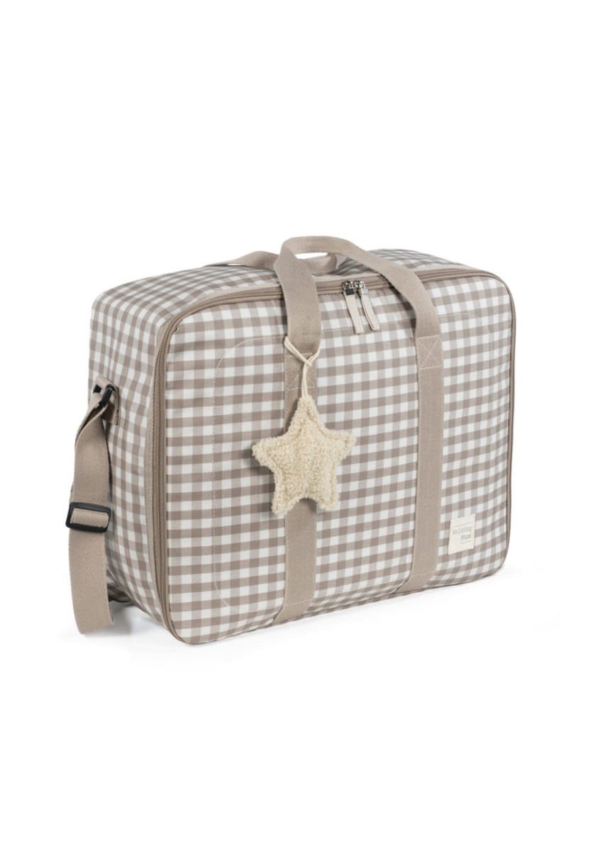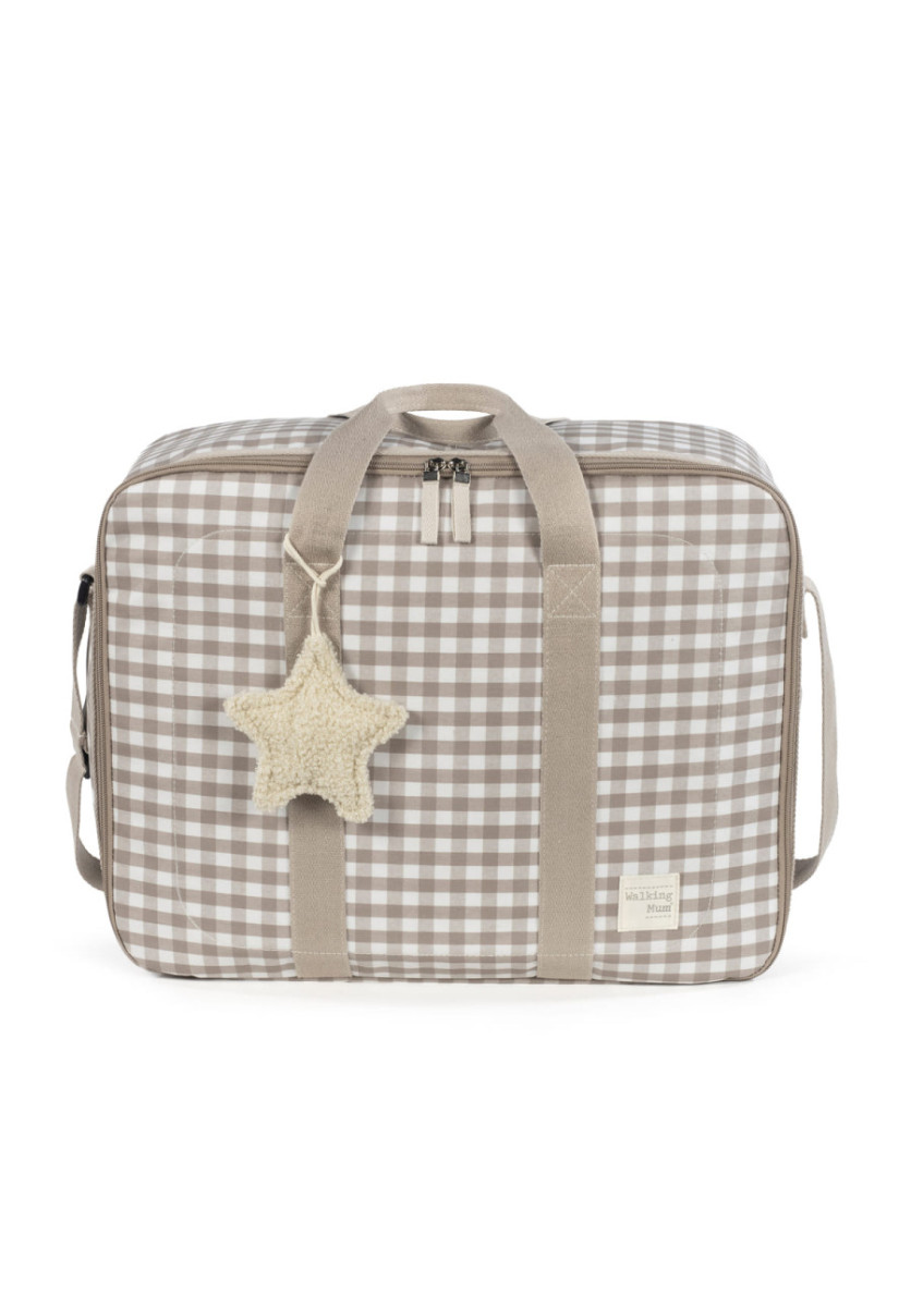 La maleta de bebé Caetana Sand de cuadros beige es un bolso especialmente diseñado para el momento más importante del embarazo, que es la llegada de tu bebé, momento en el que hay un montón de cosas que preparar. Por esto necesitas un espacio cómodo para transportar todo lo necesario para ti, el padre y el niño. Esta maleta de bebé es el modelo perfecto para cubrir todo lo que no puede faltar en este día tan especial. Es cómoda, ligera y manejable con dimensiones rectangulares y apertura práctica para tener todas tus necesidades cubiertas. Cuenta con cierre seguro de cremallera en ambas direcciones que facilitan su apertura, incluye una correa larga para llevar colgada en el hombro y asas cortas de mano. Además en el compartimiento interior tiene un forro a juego con gomas para contener la ropa y mantener todo en su lugar. Incluye un charm en forma de estrella donde puedes bordar el nombre de tu bebé para personalizar el bolso. Gran calidad y mucho estilo. Fabricado en un material resistente y de fácil limpieza a mano o a máquina a 30 °C. Walking Mum protege a tu bebé utilizando los mejores tejidos, libres de colorantes azoicos y sustancias nocivas para la salud. Nuestra colección Walking Mum guarda toda la calidad de la marca Pasito a Pasito pero con un particular sello de estilo urbano y moderno que no pasa desapercibido, para vestir diferente los paseos con tu bebé. Las bolsas de maternidad de esta línea son más sport y prácticas, especialmente pensadas en mamás y papás modernos que aprecian los diseños más actuales y en tendencia sin dejar de lado la calidad y la funcionalidad de los accesorios que complementan y hacen más cómodos todos los paseos con sus bebés. Especificaciones: Materiales: 65% algodón /35% poliéster plastificado. Medidas: 49X37X17 cm.