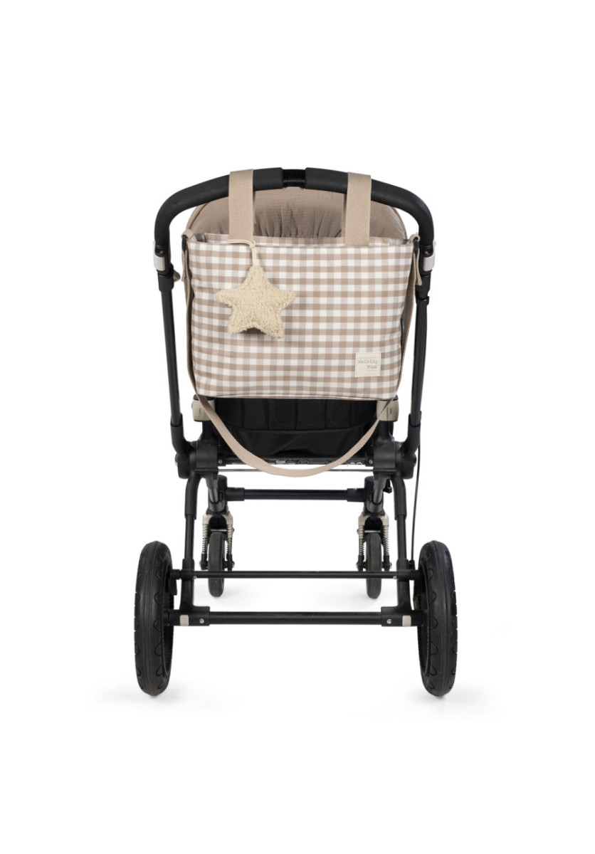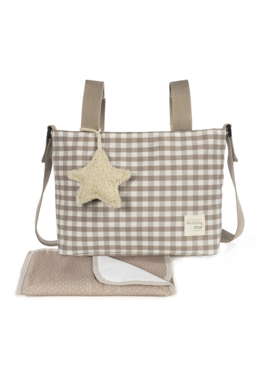 El bolso crossbody Caetana Sand de cuadros beige para silla de paseo es un modelo muy ligero además de ser resistente y espacioso para que puedas llevar todo lo que podrías necesitar durante el paseo de tu bebé. Incluye un charm en forma de estrella donde puedes bordar el nombre de tu bebé para personalizar el bolso. Aparte de la gran capacidad que tiene, está distribuido para facilitarte la organización, con varios bolsillos interiores que te ayudarán a colocar todos tus complementos ordenados y así puedes ubicarlos más fácil cuando vayas a usarlos. Dispone de un bolsillo plastificado interior para la ropa húmeda, un bolsillo térmico interior y dos bolsillos laterales. Incluye cambiador. Su diseño moderno y casual lo hacen perfecto para usar a diario y combinar con tus looks casuales o deportivos. Incorpora asas cortas con las que puedes fijarla a cualquier modelo de silla de paseo y asa larga para que te la puedas colgar en el hombro. Gran calidad y mucho estilo. Fabricado en algodón 100% con un tratamiento waterproof, de fácil limpieza a mano o a máquina a 30 °C. Walking Mum protege a tu bebé utilizando los mejores tejidos, libres de colorantes azoicos y sustancias nocivas para la salud. Nuestra colección Walking Mum está diseñada con un particular sello de estilo urbano y moderno que no pasa desapercibido, para vestir diferente los paseos con tu bebé. Las bolsas de maternidad de esta línea son más sport y prácticas, especialmente pensadas en mamás y papás modernos que aprecian los diseños más actuales y en tendencia sin dejar de lado la calidad y la funcionalidad de los accesorios que complementan y hacen más cómodos todos los paseos con sus bebés. Especificaciones: Materiales: 65% algodón /35% poliéster plastificado. Medidas: 33X25X12 cm.