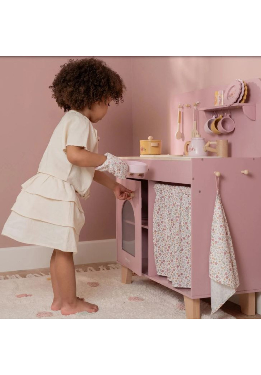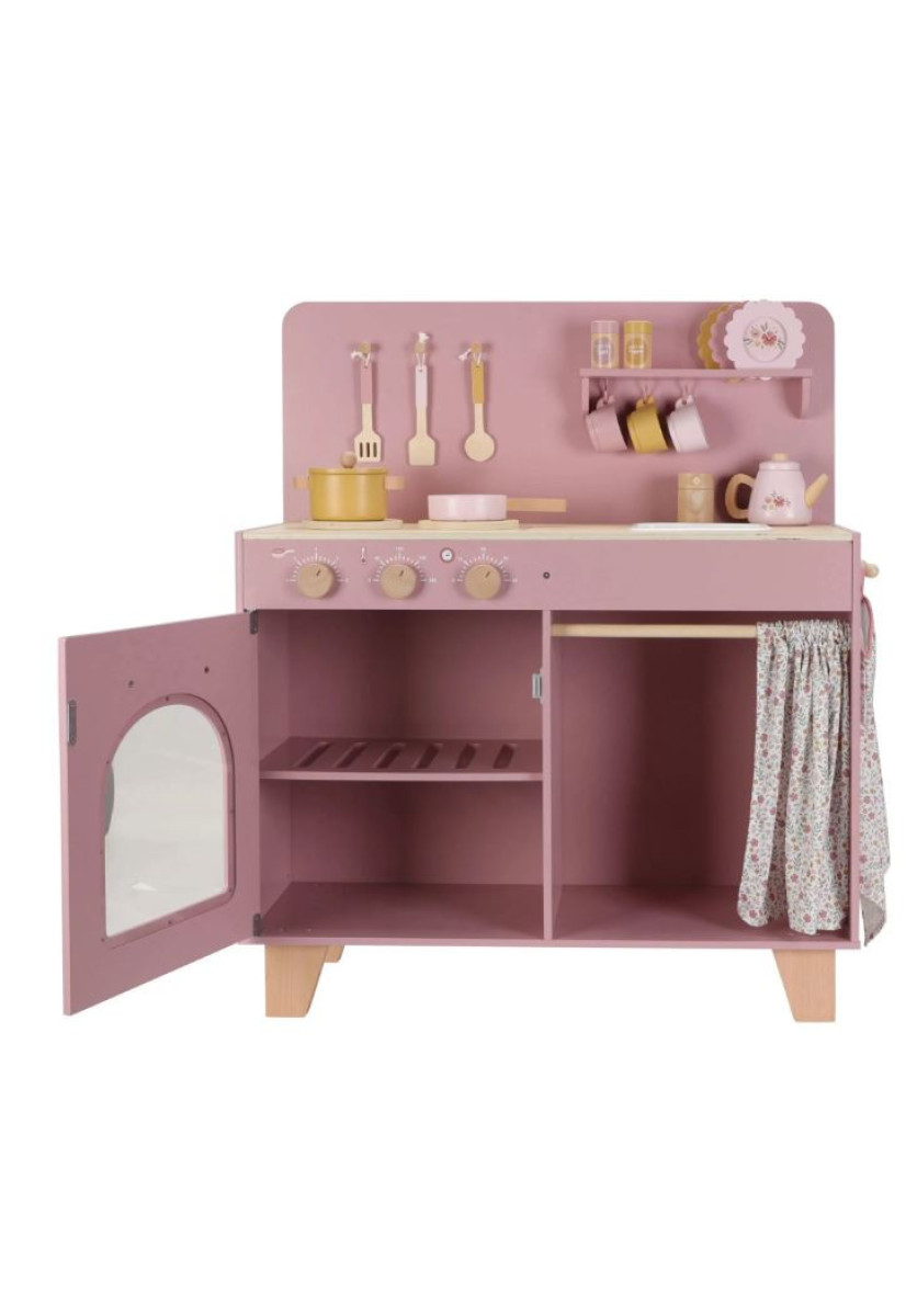 ¡Pequeños chefs, presten atención! Con esta cocina de juguete rosa de madera, se sumergirán en el mundo de la cocina y la repostería. El set incluye dos sartenes, utensilios de cocina, tres tazas y tres platos, todos con alegres ilustraciones. Horneen un pastel o cocinen verduras en la estufa, que emite un sonido de cocción lenta en cuanto colocan una sartén sobre ella. Lávense las manos en el fregadero y guarden la compra en el armario. El horno tiene botones reales con ilustraciones, y con el juego de pimienta y sal, le darán un toque especial a cada plato. La cortina de tela, el paño de cocina y la manopla de horno están decorados con el suave estampado "Flores Suaves". ¡Una cocina de juguete con un ambiente acogedor para una diversión culinaria sin límites!