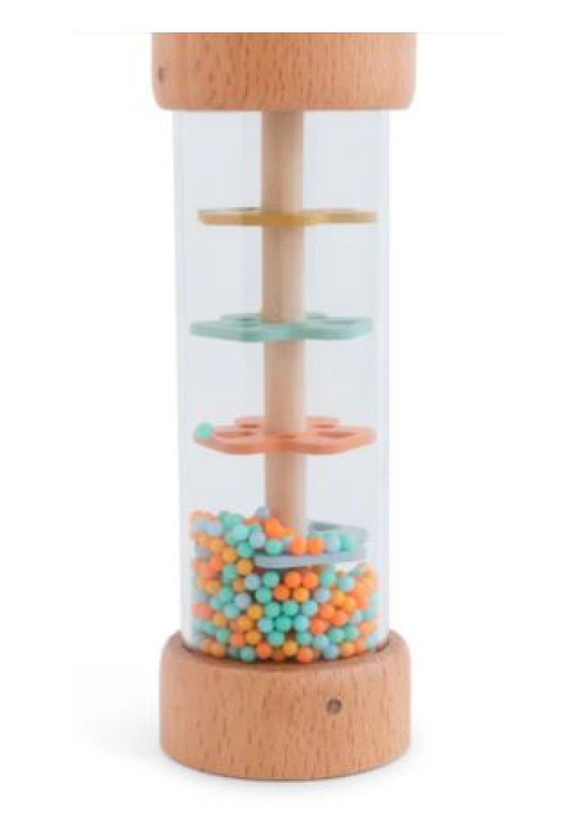 Este sonajero se convertirá en el juguete favorito de tu pequeño. Es tan relajante como hipnótico. Cuando lo giras, las pequeñas bolitas caen por el tubo y bajan poco a poco por cada separador, produciendo un sonido calmante similar a las gotas de lluvia.