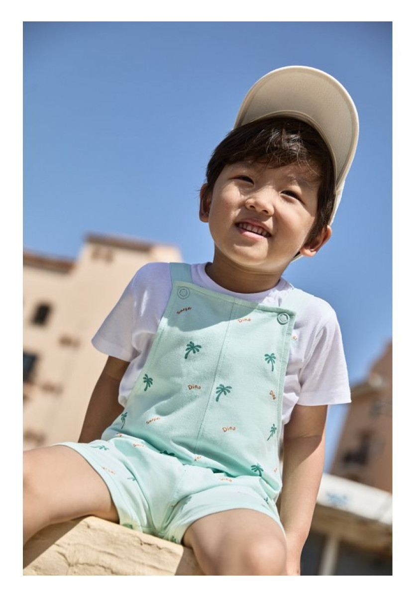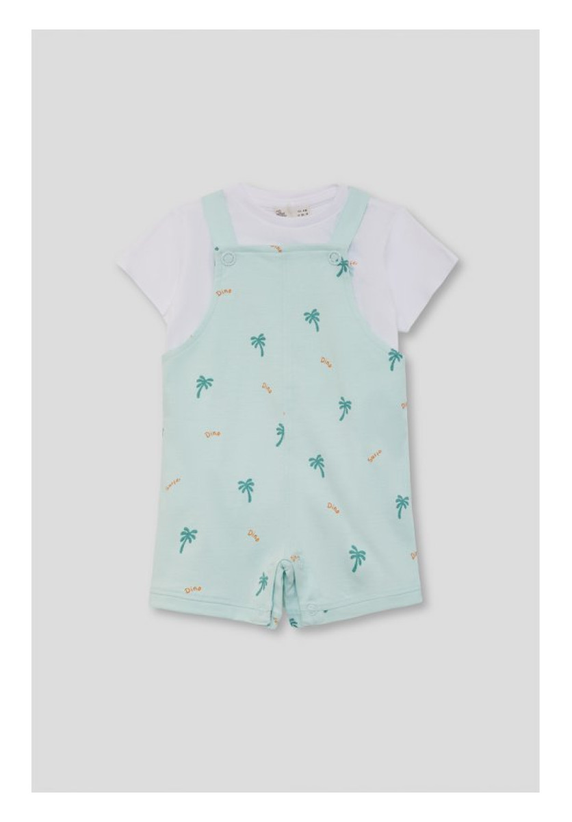 Conjunto de dos piezas, camiseta y peto para niño. Camiseta blanca de manga corta con cuello redondo. Peto en color verde agua con estampado de palmeras y texto, tirantes abotonados y cierre con botones a presión en la parte inferior.