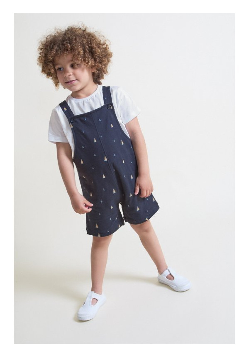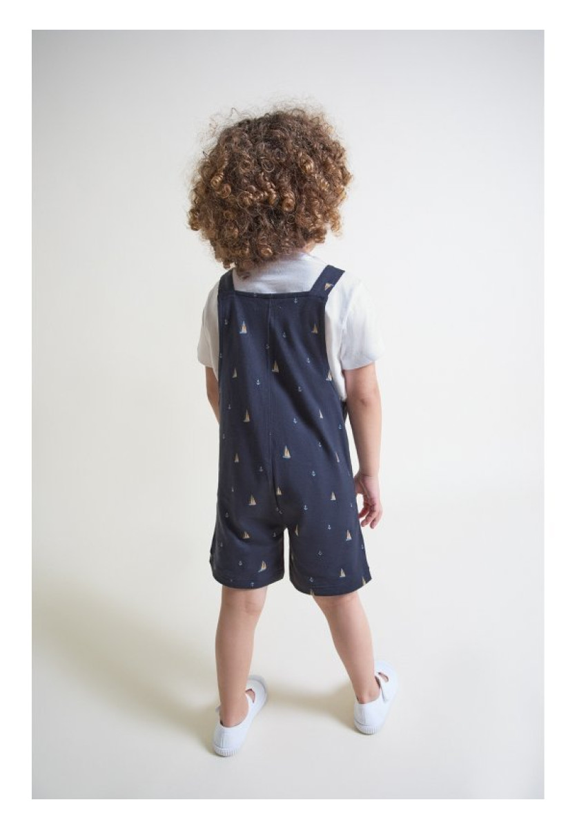 Conjunto de dos piezas, camiseta y peto para niño. Camiseta blanca de manga corta con cuello redondo. Peto corto en color azul marino con estampado de veleros y anclas, tirantes abotonados y cierre con botones a presión en la parte inferior.