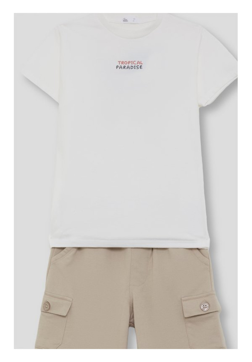 Conjunto de camiseta y bermudas disponible en color crudo y beige. Camiseta con detalle estampado “Tropical Paradise” y bermudas con bolsillos laterales tipo cargo. Fresco y cómodo para el verano.