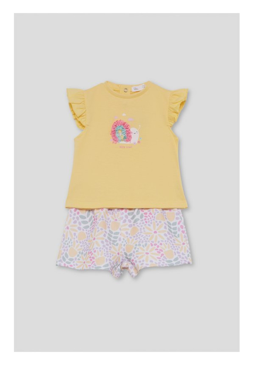 Conjunto de dos piezas, camiseta y shorts para bebé niña. Camiseta amarilla con volantes en las mangas y estampado central con relieve. Shorts en color crudo con estampado floral multicolor. Tejido cómodo y fresco, ideal para verano.