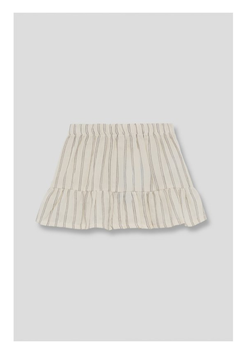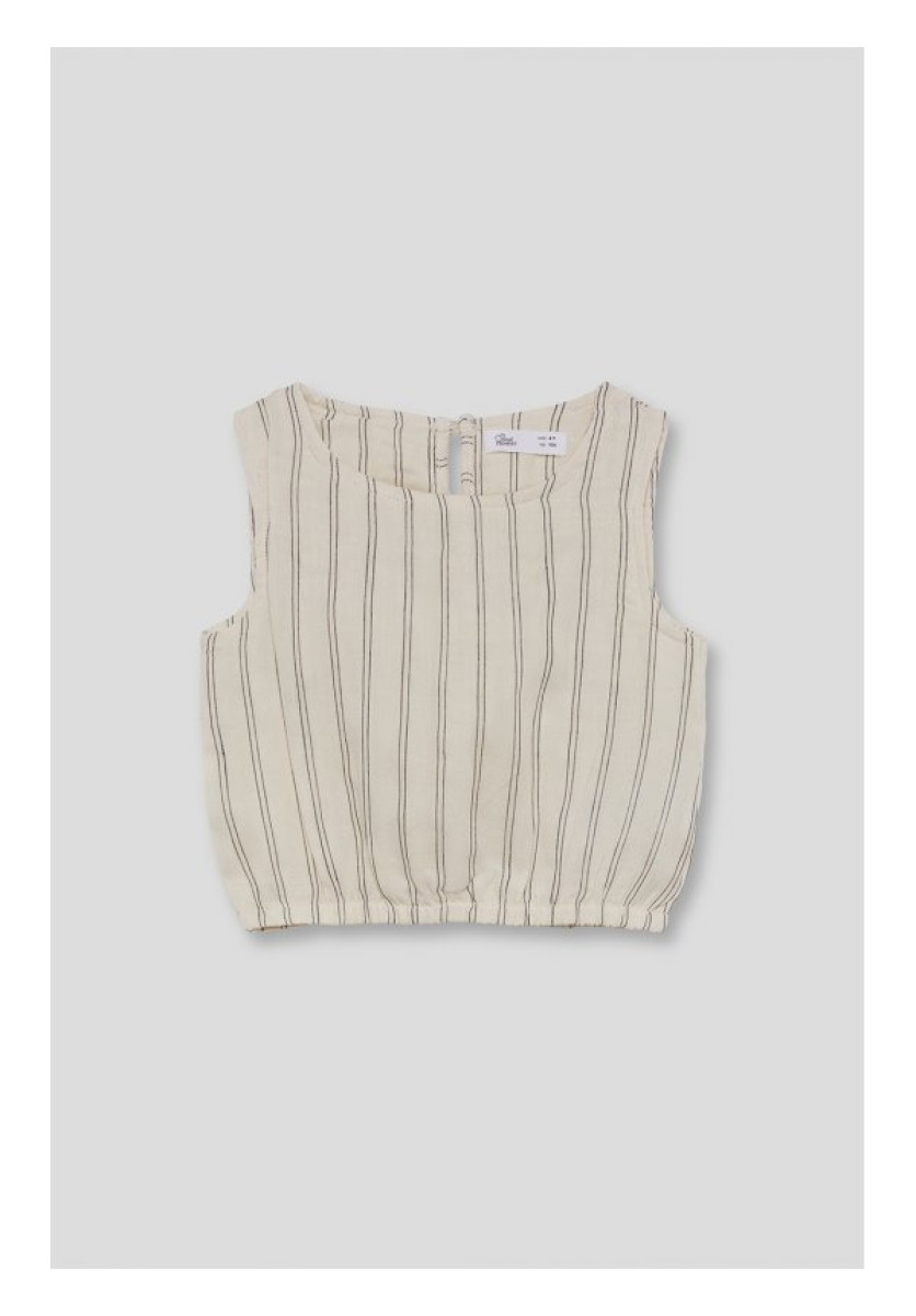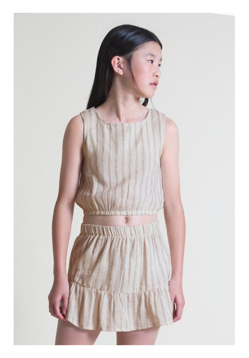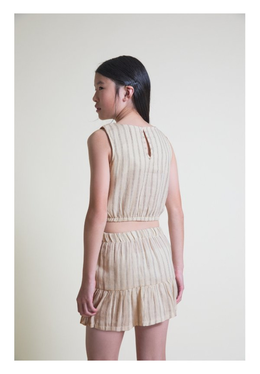 Top sin mangas y falda para niña. Diseño en color beige con finas rayas verticales y cierre de botón en la espalda. Elástico en el bajo para un ajuste cómodo, ideal para combinar con faldas o shorts de la temporada.