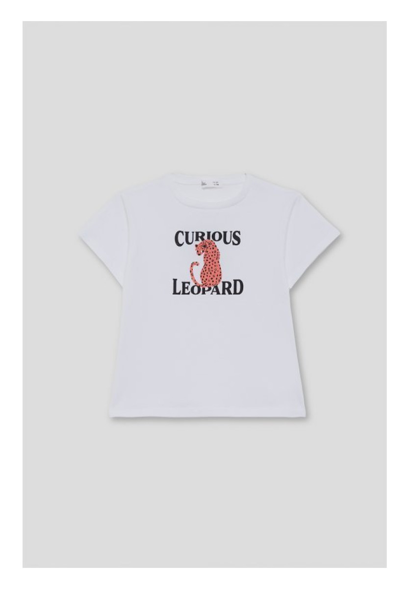 Camiseta de manga corta para niña en color blanco. Estampado central con leopardo y texto “Curious Leopard”, confeccionada en tejido suave y cómodo.
