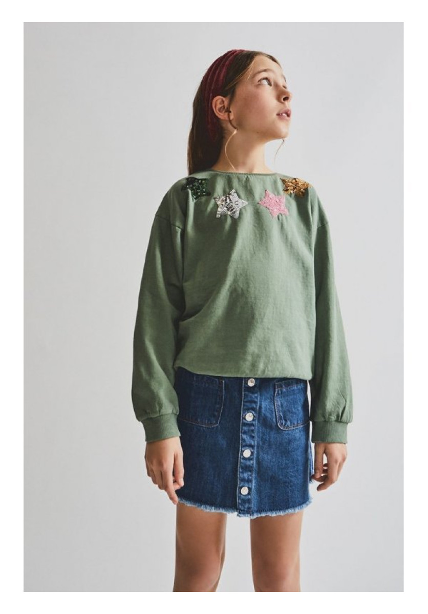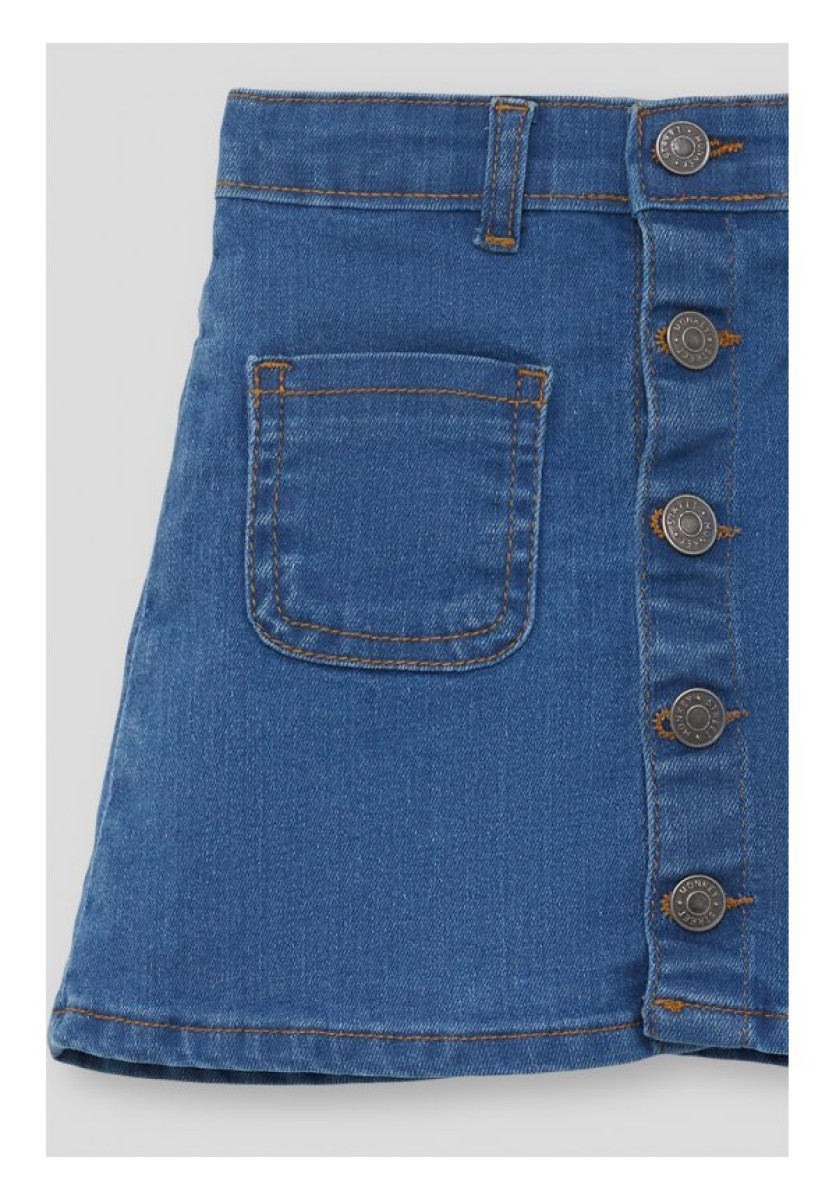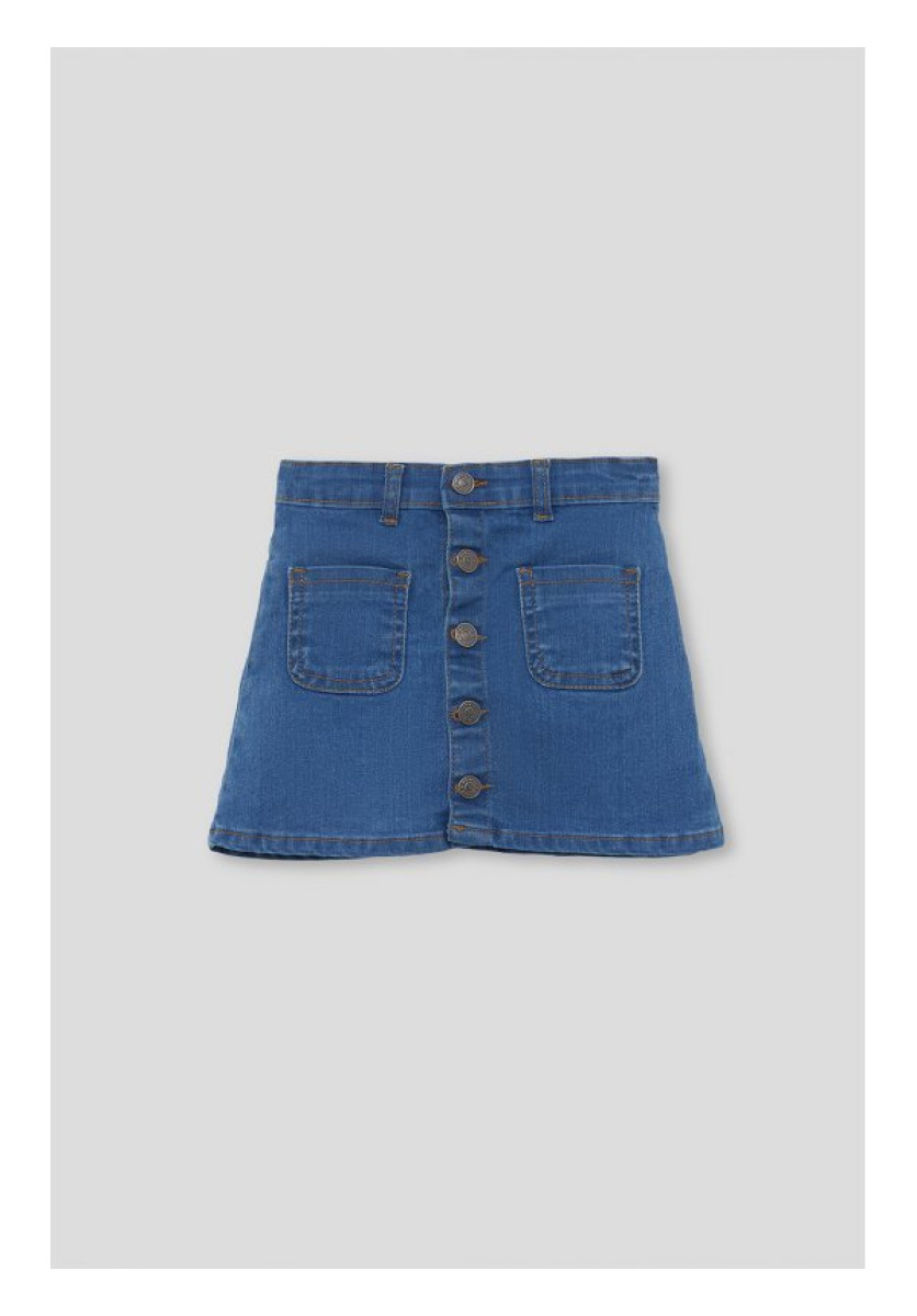 Falda para niña. Falda vaquera en color denim. Botones en la parte frontal para una mejor abertura. Bolsillos vistosos en la parte frontal y en la parte trasera. Aplique para cinturón. Ideal para el invierno.