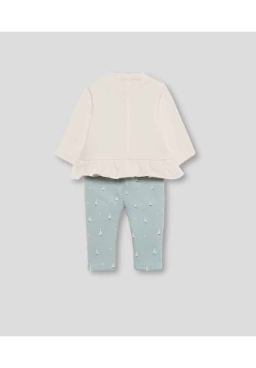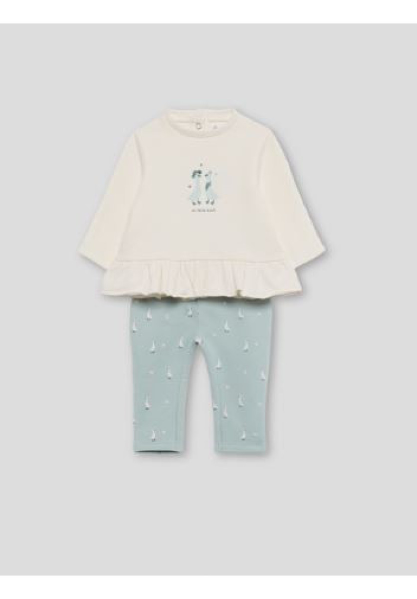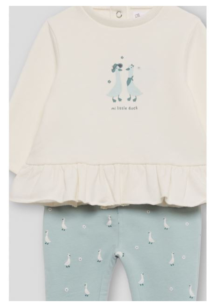 Conjunto de dos piezas, camiseta con volante y leggings para recién nacido de 1 a 24 meses. Conjunto en tonos crudo y eucalipto con un diseño dulce y actual. La camiseta de manga larga en color crudo está confeccionada en punto suave, con estampado central de dos patitos y la frase “mi little duck”. El bajo presenta un delicado volante fruncido y se completa con apertura trasera con botones para facilitar la puesta en las tallas pequeñas. Los leggings en color eucalipto están decorados con un encantador estampado de patitos y pequeños detalles florales. Su tejido elástico proporciona ajuste y confort durante todo el día. Un conjunto ideal para combinar comodidad y estilo en el día a día del bebé.