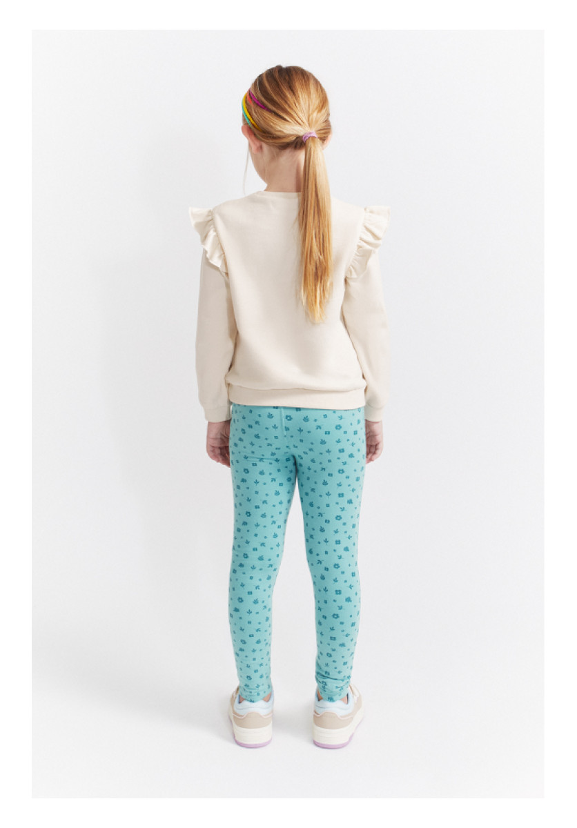 Conjunto de dos piezas, sudadera y leggings para bebé niña de 3 meses a 6 años. Sudadera en color crudo con volantes en los hombros y estampado frontal de koala en tonos pastel, acompañado del texto “Koala” en colores suaves. Presenta cuello redondo y cierre trasero con botones a presión para facilitar la puesta en las tallas más pequeñas. Acabados en canalé en puños y bajo. Se combina con leggings en color verde amazona con estampado floral en contraste, y cinturilla elástica para mayor comodidad. Confeccionado en felpa cálida y suave, perfecta para el invierno