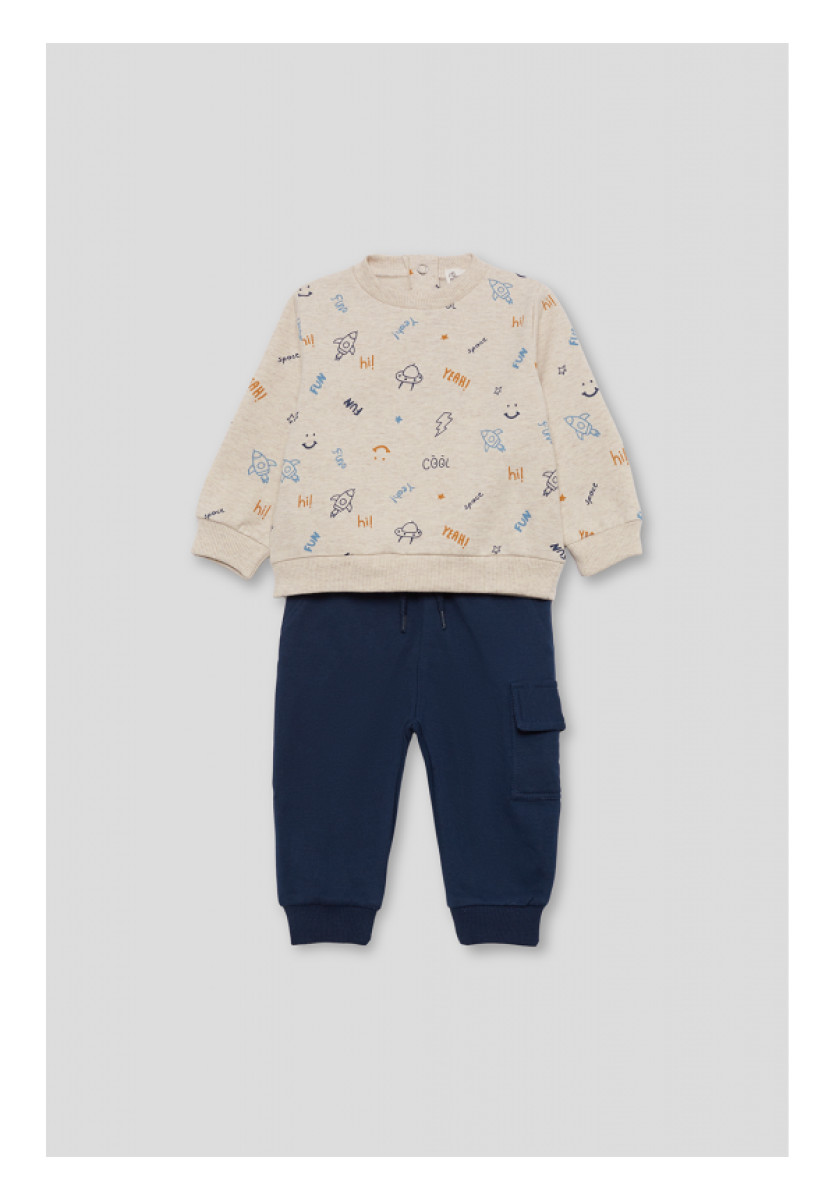Conjunto de dos piezas, sudadera y pantalón para niño de 3 meses a 6 años. Sudadera de felpa en color crudo con original estampado all over de motivos espaciales y tipografías en tonos azul, mostaza y naranja. Cuello redondo, puños y bajo elásticos a tono. Pantalón tipo jogger en azul noche, con cinturilla elástica, bajo ajustado y bolsillo lateral tipo cargo. Un conjunto cómodo, divertido y perfecto para disfrutar del invierno con estilo.