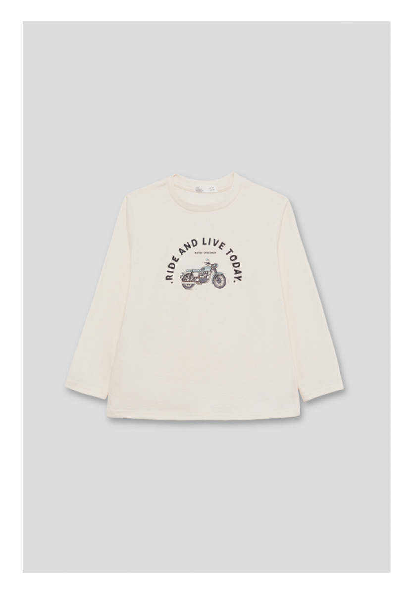 Camiseta de manga larga disponible en tallas de 2 a 16 años. Camiseta confeccionada en punto suave de algodón, esta camiseta en color crudo presenta cuello redondo y diseño frontal con ilustración de motocicleta y texto “RIDE AND LIVE TODAY”. Un básico cómodo y versátil para el día a día