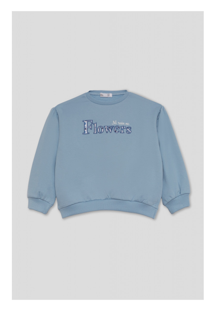 Sudadera de manga larga para niña. Sudadera en color celeste confeccionada en tejido de punto suave, con cuello redondo y acabado en canalé en puños y bajo. Presenta diseño con frunces sutiles en los hombros y estampado frontal con el mensaje “No rain no Flowers”, decorado con detalles florales en relieve. Una prenda alegre y cómoda que combina estilo y optimismo para los días más frescos.
