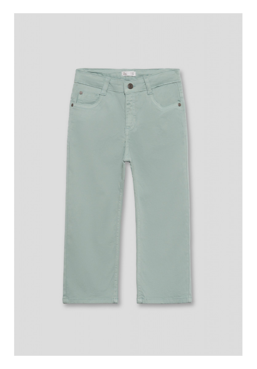 Pantalón largo en color verde iceberg con corte recto y tejido de sarga elástica para mayor comodidad. Presenta cinco bolsillos, cierre con botón metálico y cremallera, y cintura ajustable mediante goma interior con botones. Un básico versátil y actual, perfecto para combinar con cualquier parte de arriba de la colección.