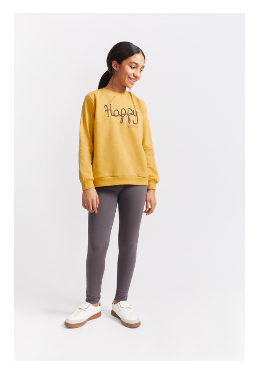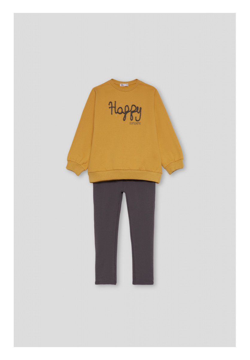 Conjunto de dos piezas, sudadera y leggings para niña. Sudadera en color mostaza con cuello redondo, mangas largas con puños elásticos y diseño frontal con el texto “Happy” bordado en hilo negro decorado con pequeñas perlas, acompañado de la palabra “SUNSHINE” estampada en tono maquillaje. Se combina con leggings largos en color gris oscuro, de corte ajustado y cinturilla elástica. Un conjunto alegre y cómodo para disfrutar cada día con energía y estilo.