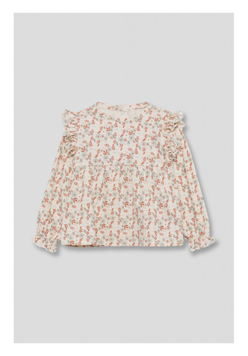 Blusa de manga larga para niña. Blusa estampada con fondo crudo y motivo floral en tonos tinto y gris, confeccionada en tejido ligero con caída suave. Presenta corte con frunces bajo el canesú, manga larga acabada en puño elástico con volante y volantes decorativos en los hombros. Un diseño romántico y cómodo, perfecto para combinar con jeans o pantalones de punto en looks de otoño