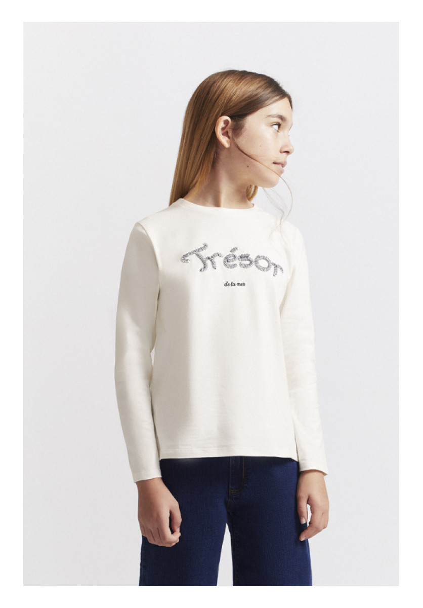 Camiseta de manga larga para niña disponible en color blanco roto. Camiseta en punto liso con cuello redondo y estampado frontal con relieve y texto decorativo “Trésor de la mer” en azul marino. Su diseño minimalista y el suave tejido de algodón la convierten en una prenda versátil y cómoda para el día a día.