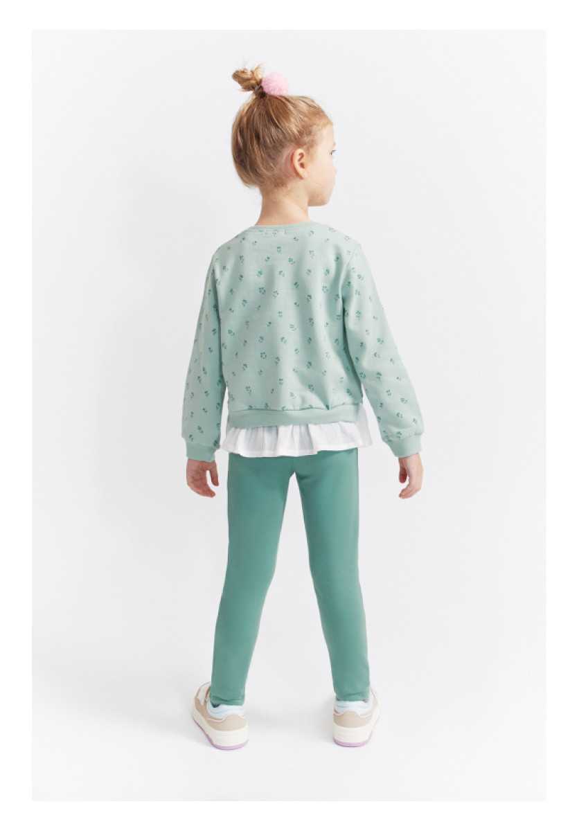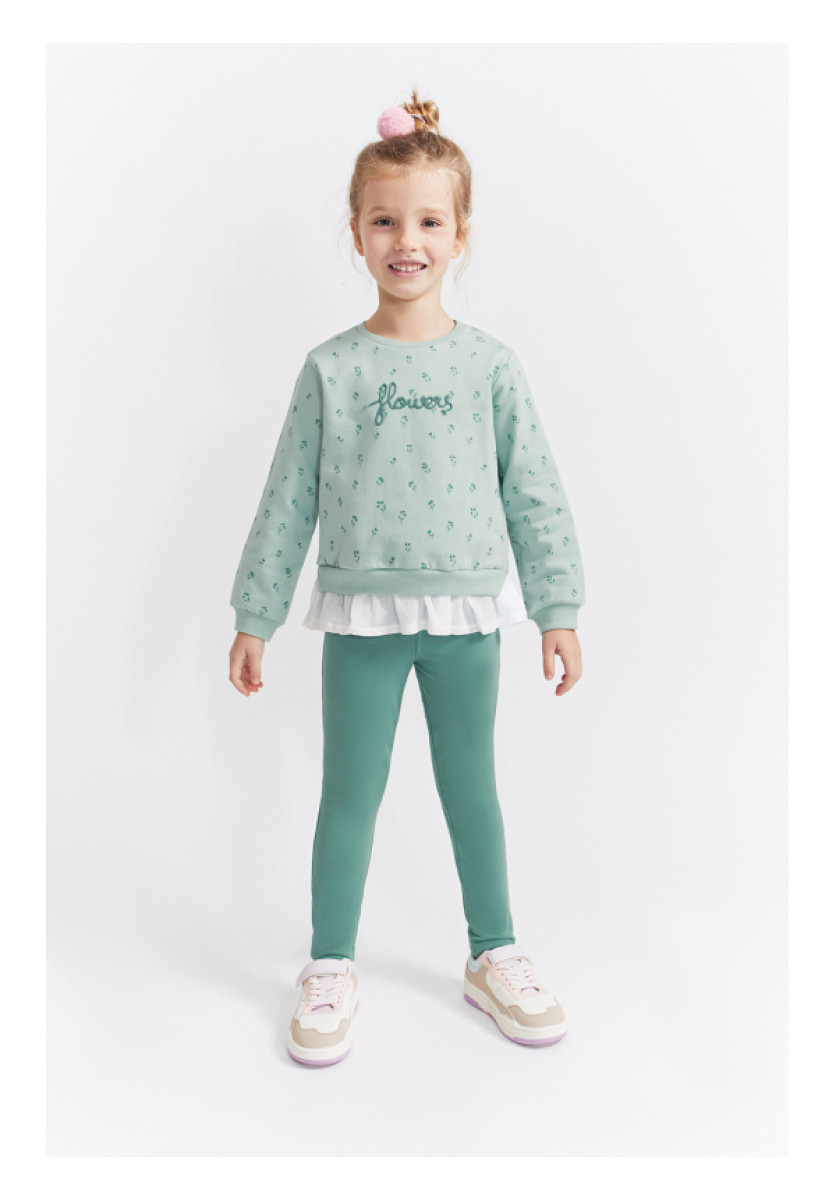 Conjunto de dos piezas, sudadera y leggings para bebé niña. Este conjunto cómodo y lleno de encanto es perfecto para los días de invierno. La sudadera en color verde azulado con estampado floral incorpora la palabra “flowers” bordada en relieve en el pecho. Lleva un falso bajo con volante de gasa blanca que aporta un delicado efecto de superposición. Los puños y el bajo son elásticos para un ajuste cómodo. Los leggings en color verde azulado a juego completan el conjunto con un diseño sencillo, ceñido y muy cómodo, ideal para el día a día. Las tallas de meses incluyen cierre de botones en la espalda para facilitar la puesta. Confeccionado en tejido afelpado suave y cálido, este conjunto es ideal para combinar dulzura y libertad de movimiento en cualquier momento del día.