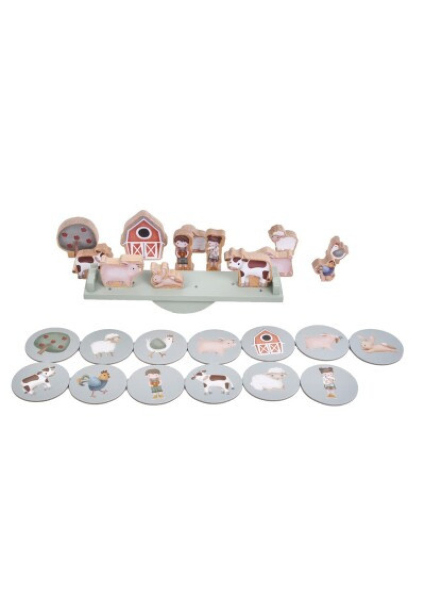 _¿Cuántas figuras puedes equilibrar? Da la vuelta a una carta y coloca la figura que coincida con tu carta en el prado. ¡Tenga cuidado de no balancear demasiado la balanza, o las figuras se caerán! Este juego de equilibrio es divertido para jugar solo, pero también con toda la familia. El equilibrio mejora la coordinación mano-ojo y las habilidades motoras finas de su hijo. El juego incluye 13 cartas redondas, 1 balanza, varios animales, Jim y Rosa, un árbol y una granja.