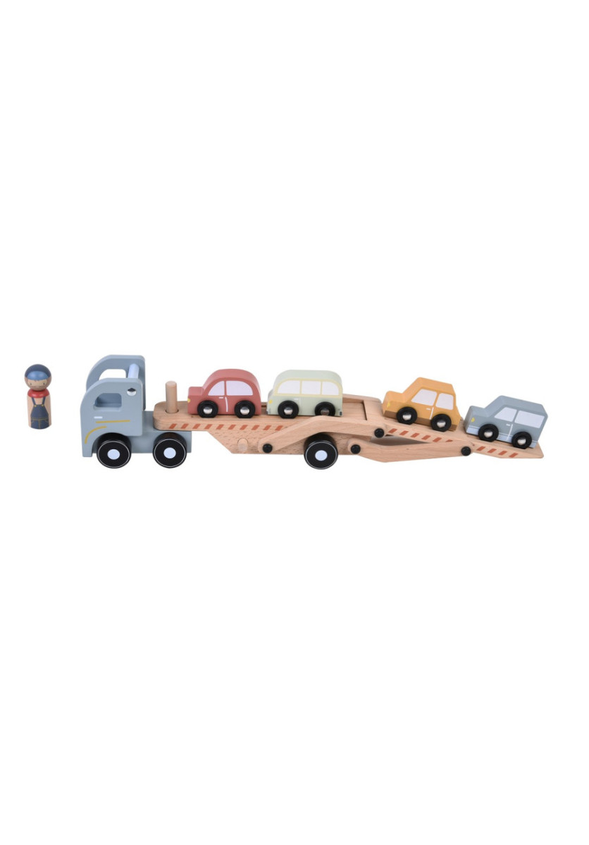 _¡Oh no! Problemas con el coche en la carretera. Por suerte, llevar los 4 vehículos incluidos al garaje no supone ningún problema para este camión de madera. ¿Ayudarás a cargar los coches en el camión a través del remolque? De esa manera, el conductor del camión puede ponerse a trabajar rápidamente. ¡Un verdadero imprescindible para los fanáticos de los coches más pequeños!