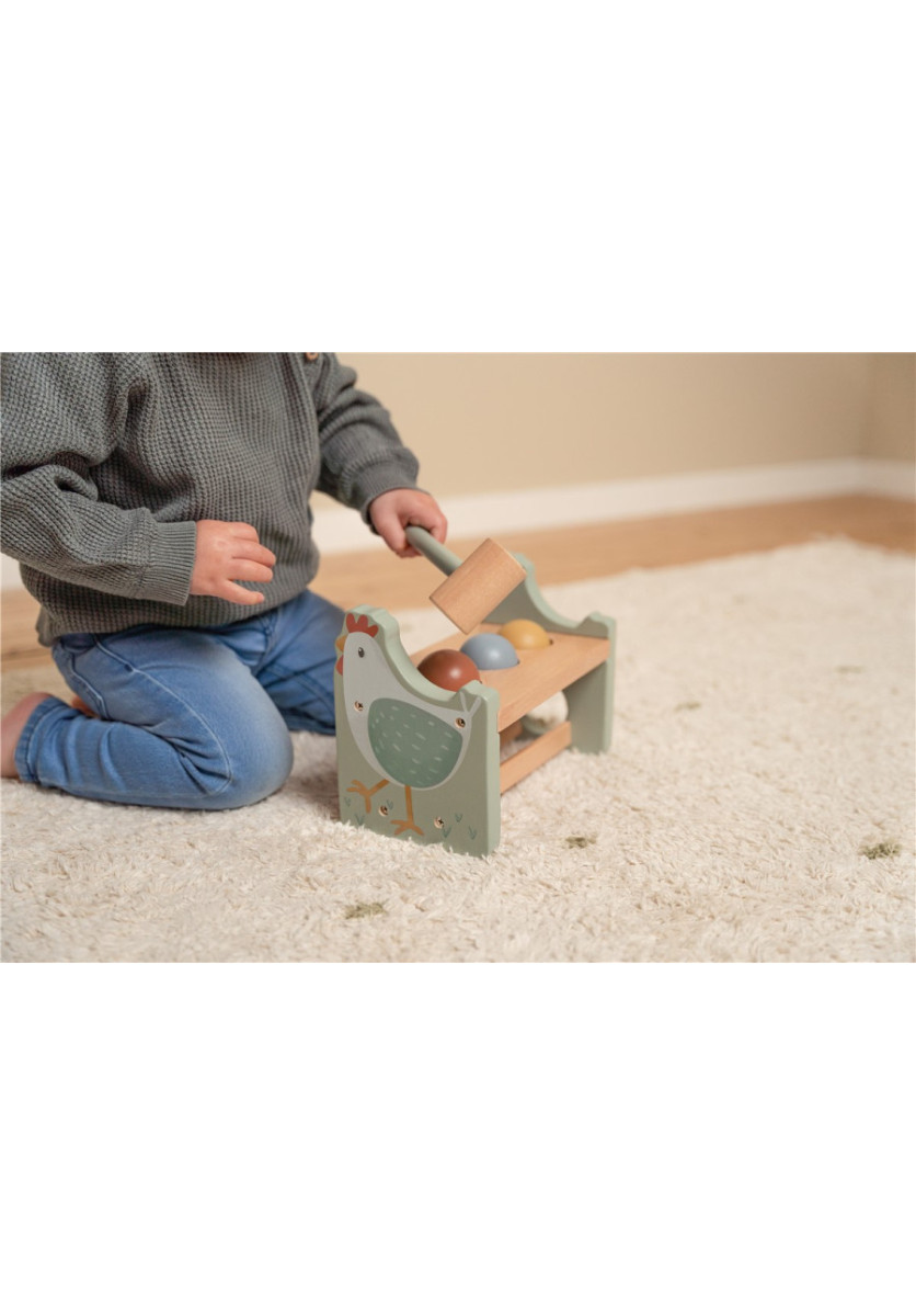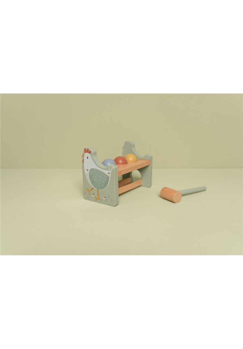 _¡Tik tik tik! Haz que la gallina ponga un huevo golpeando las 3 bolas en el banco de golpeo de madera con el martillo. Este es un buen ejercicio para las habilidades motoras de su hijo. ¿Han entrado todas las bolas? Vuelve a colocar las bolas y comience de nuevo. ¡Estarán ocupados con esto por un tiempo!