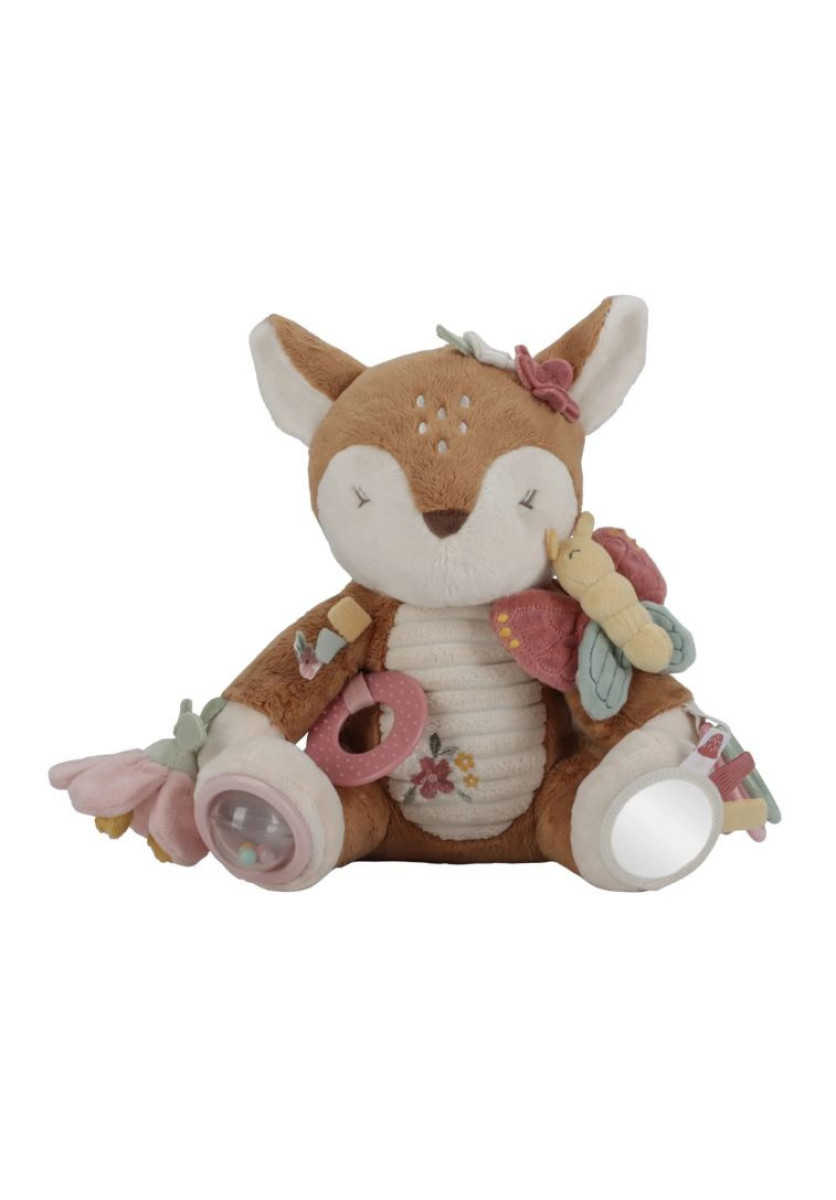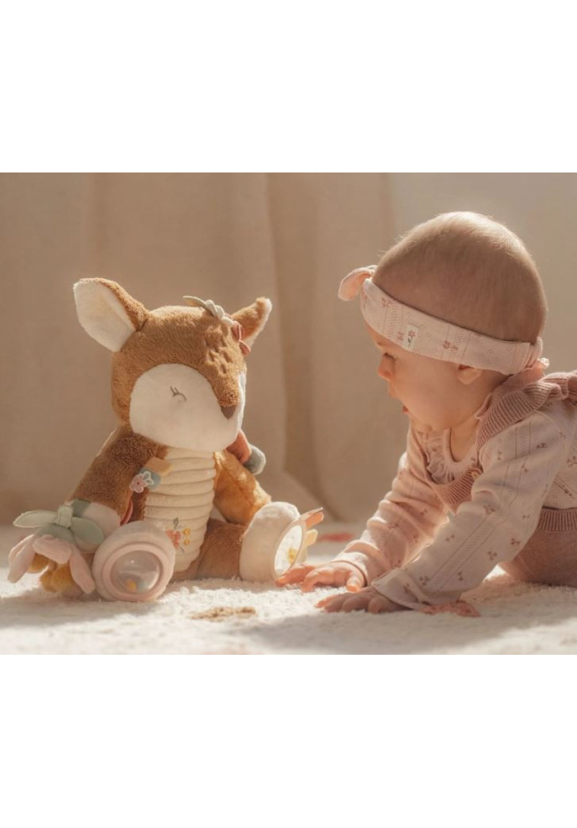 ¡Acurrúcate y juega! Este adorable cervatillo promete mucho más que solo abrazos. Descubre todas las actividades que esconde. El sonido de cascabel, la mariposa crujiente en el hombro, y las etiquetas y flores para jugar. Los anillos en la pata y el espejo bajo una pata: muchísimos detalles para despertar la curiosidad de tu pequeño. Y después de tanto jugar, el adorable cervatillo inspira los sueños más dulces sobre el Jardín de Hadas.