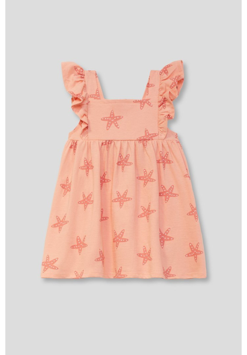 Vestido para niña. Vestido sin mangas en color salmón con estampado de estrellas de mar. Tirantes con volantes y corte con vuelo que aporta frescura y comodidad.