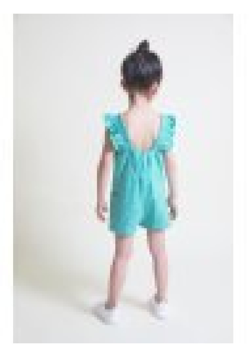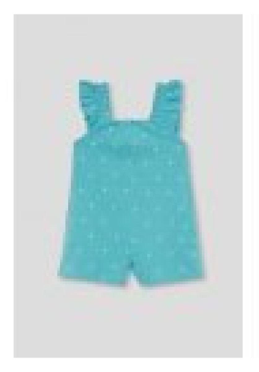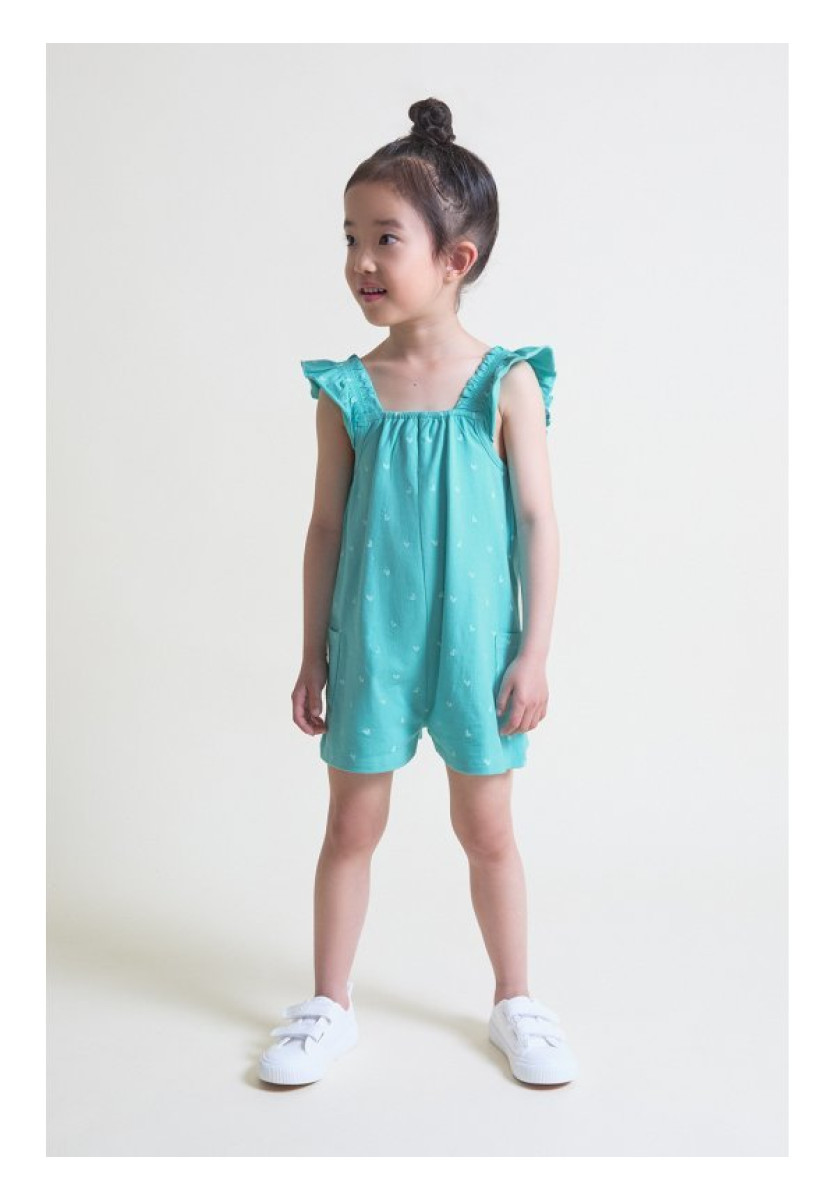 Mono corto para bebé niñas. Color turquesa con estampado de pequeños corazones blancos, tirantes con volantes y bolsillos laterales. Confección en algodón suave, ideal para verano.