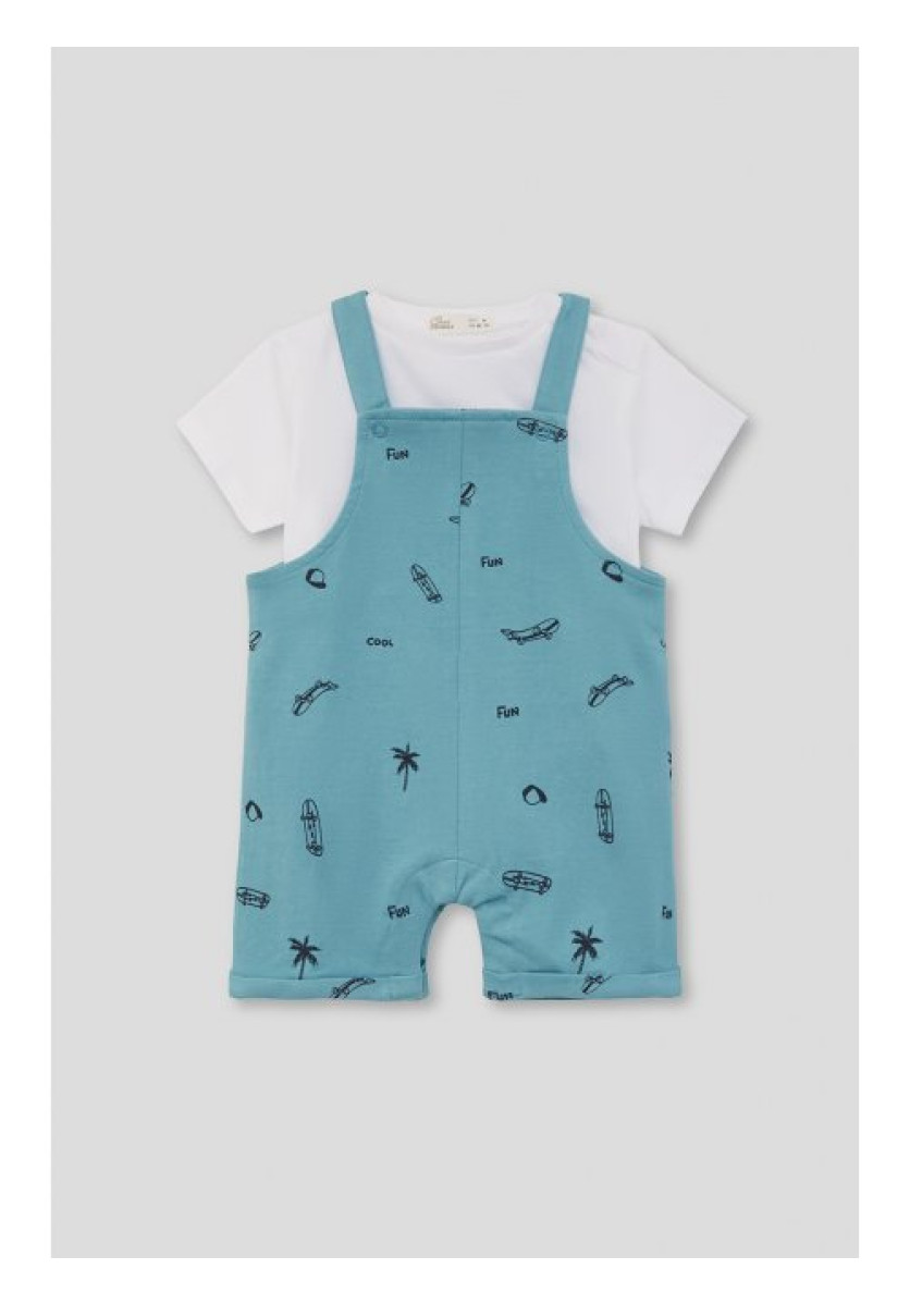 Conjunto de dos piezas para bebé niño. Camiseta de manga corta en color blanco con cuello redondo y cierre en la espalda. Peto corto en color azul con estampado veraniego de palmeras, gafas y monopatines.