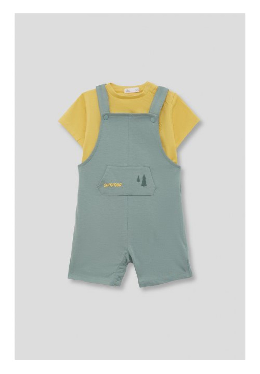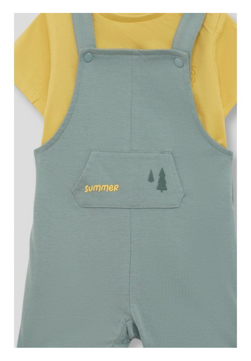 Conjunto de dos piezas, camiseta y peto para niño. Camiseta de manga corta en color amarillo con detalle “Kids Camp” en el pecho. Peto corto en color verde iceberg con bolsillo frontal decorado y tirantes cruzados con botones a presión.