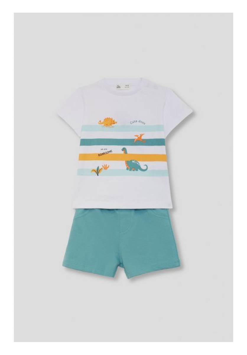 Conjunto de dos piezas, camiseta y shorts para niño. Camiseta blanca de manga corta con franjas de colores y estampado de dinosaurios. Shorts en color verde con cintura elástica y bolsillos delanteros.