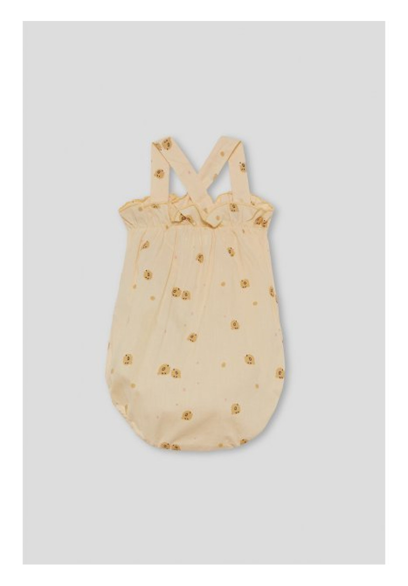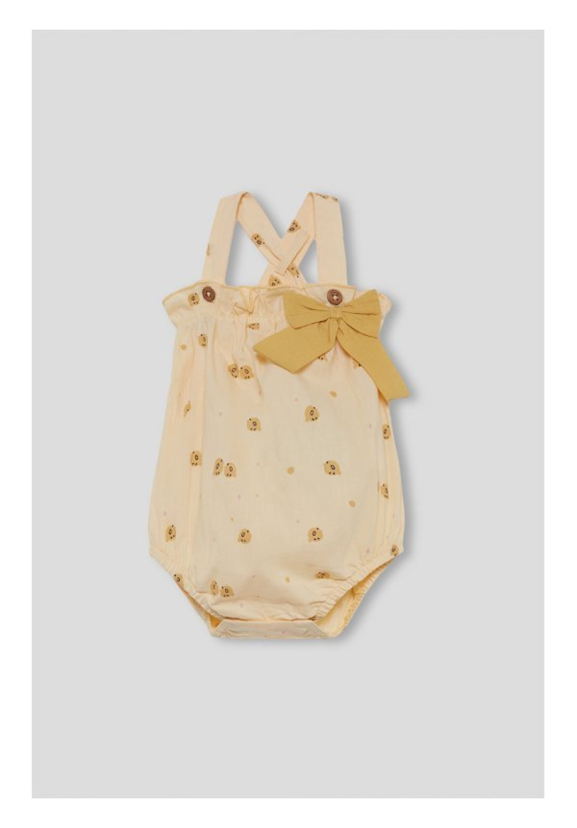 Ranita con tirantes para bebé niña. Ranita en color maíz con estampado de pequeños pollitos y lunares. Diseño con tirantes que se cruzan en la espalda y botones en la parte delantera para mayor ajuste. Destaca el lazo decorativo en tejido liso al tono colocado en la cintura, que aporta un aire delicado y coqueto. La prenda cuenta con goma elástica en las piernas para un mejor ajuste y comodidad en el movimiento. Confeccionada en tejido ligero y transpirable, perfecta para los días cálidos de verano.