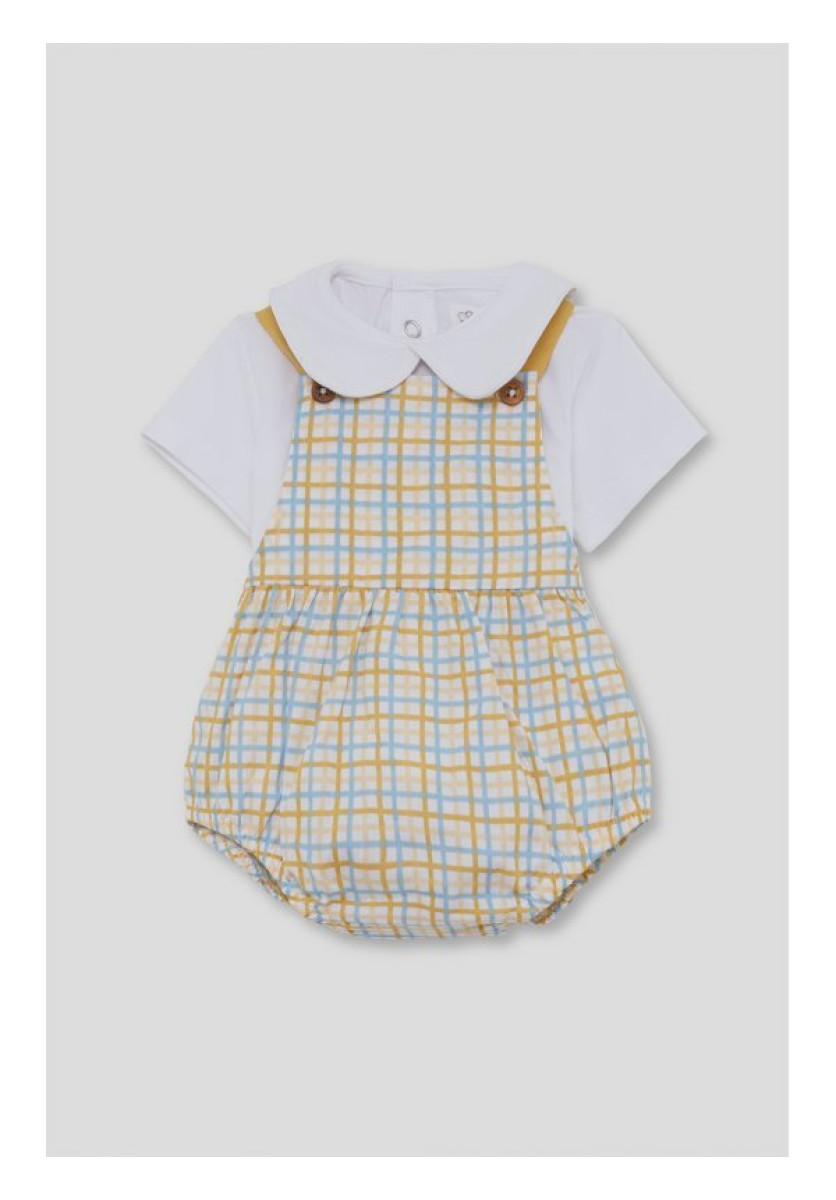 Conjunto de dos piezas para recién nacido niño. Camiseta sin mangas en color rosa con estampado central de perrito. Detalle de volantes en los hombros que aportan un toque dulce y delicado. Cuello redondo y cierre con botones a presión en la parte trasera para facilitar el cambio. Braguita en color blanco con estampado de motas en tono gris. Diseño con volantes en la parte trasera y cintura elástica para un ajuste cómodo. Confeccionado en tejido suave y transpirable, ideal para los días cálidos de verano, garantizando comodidad y libertad de movimiento.