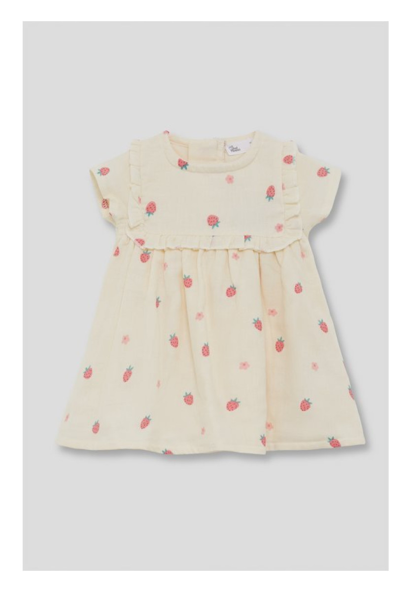 Vestido para bebé niña. En color crudo con estampado de fresas y pequeñas flores. Diseño con volantes en el canesú y mangas cortas, con abertura de botones en la espalda para vestir con facilidad