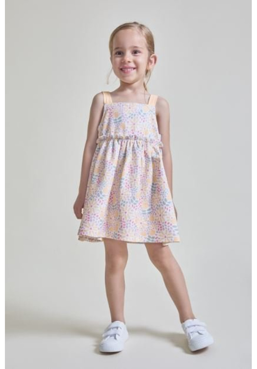 Vestido en tejido crudo con tirantes en color amarillo y estampado multicolor de flores y frutas. Diseño ligero y fresco, ideal para el verano.