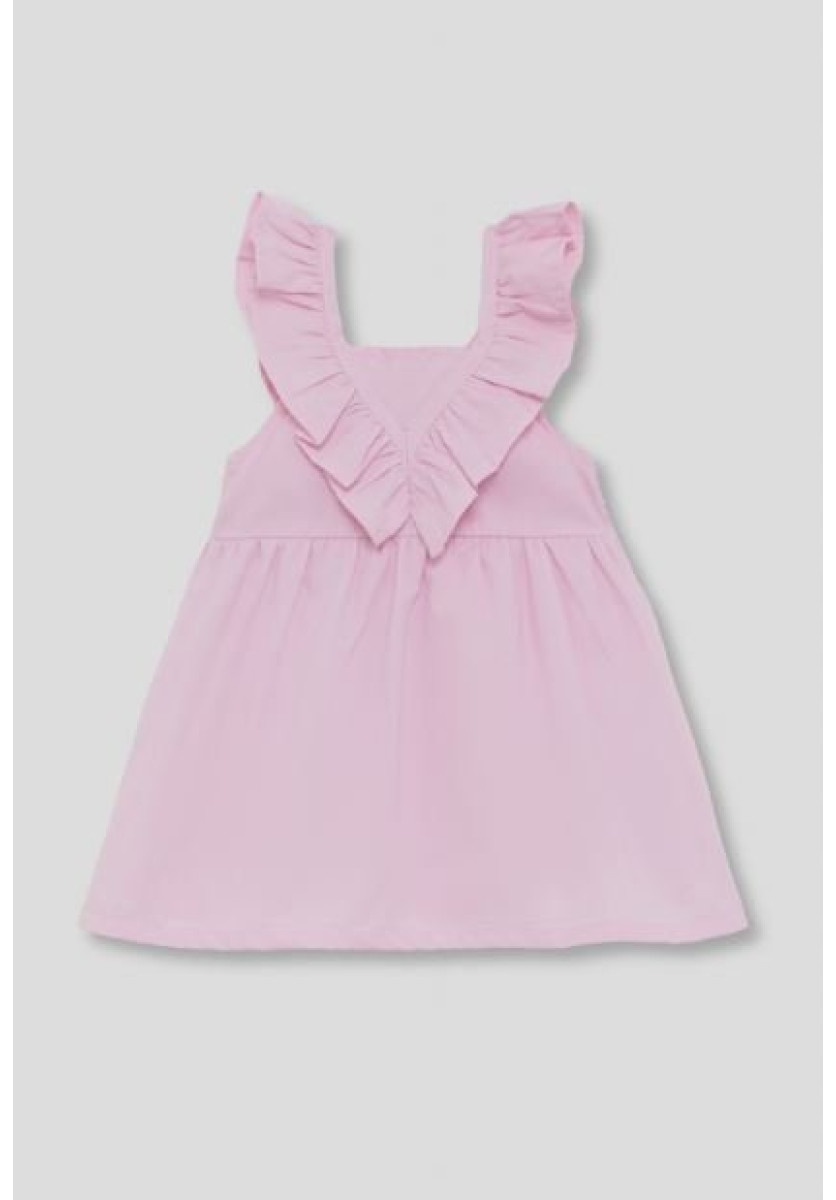 Vestido sin mangas para bebé niña. Disponible en color lila, con detalle de volantes en el escote en pico y falda de corte amplio. Tejido ligero y fresco, ideal para los días de verano.